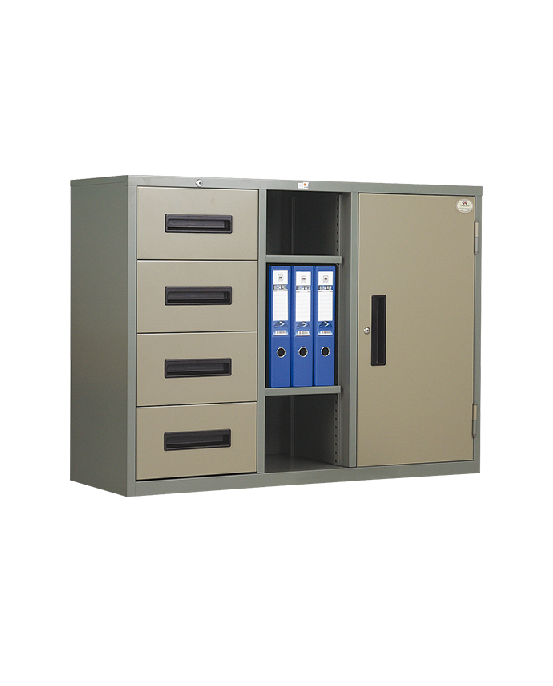 - ตู้เอนกประสงค์ชนิด 1 บานประตู และ 4 ลิ้นชัก พร้อมช่องวางของเปิดโล่ง ปรับระดับได้ ขนาดกว้าง 1187 x ลึก 408 x สูง 878 มม.